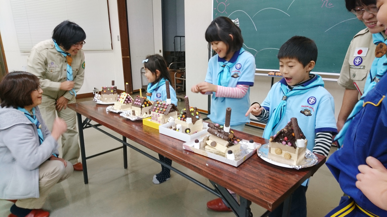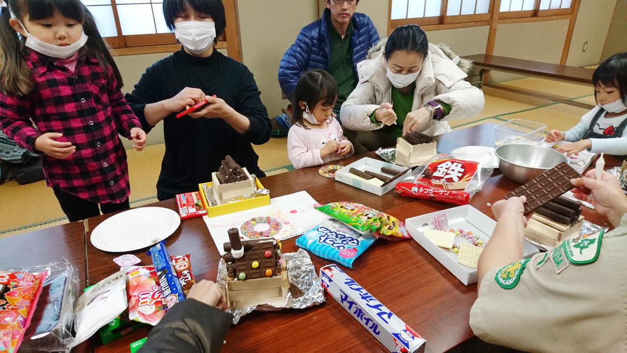開会前にウエハースやチョコレートで「お菓子の家」を作っていました。