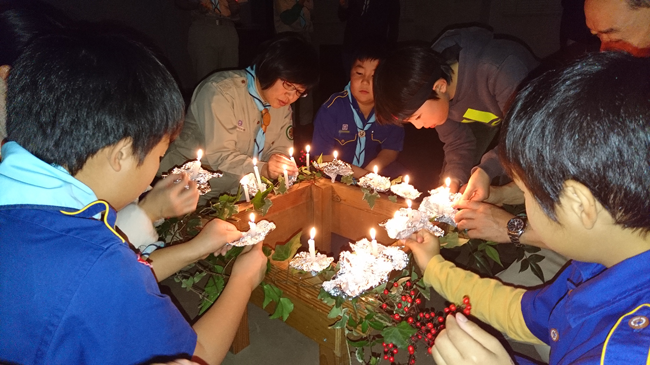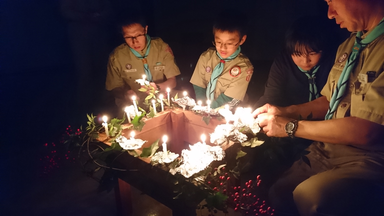 スカウト、リーダー、保護者がそれぞれ1年間の思い出や反省と今後の目標を話し、燭台にろうそくを飾りました。