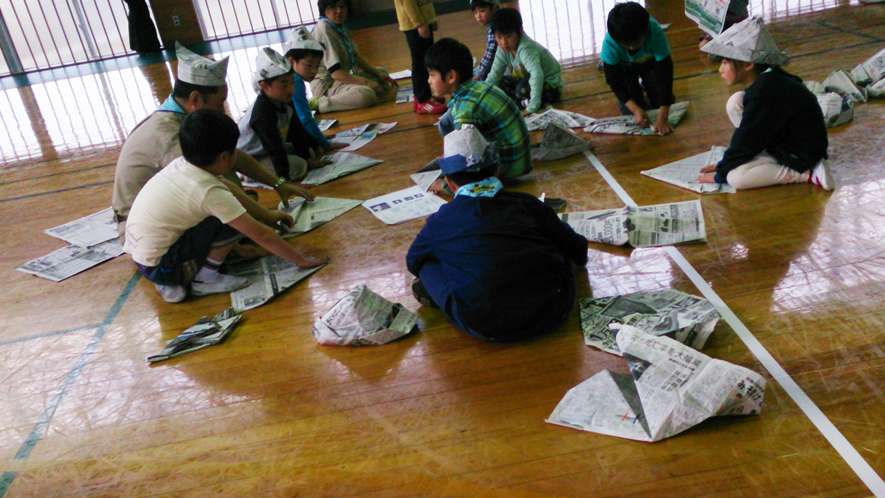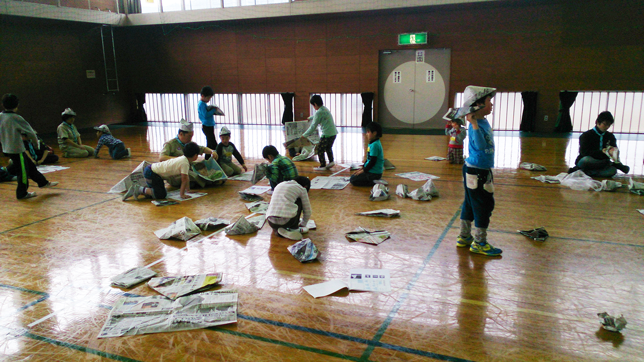 工作の接着剤が乾くまでの間、新聞紙を使った折り紙をしました。