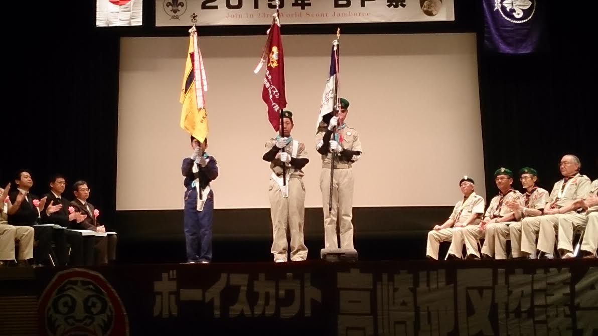 セレモニーではまず高崎地区各団が隊旗を手に入場しました。