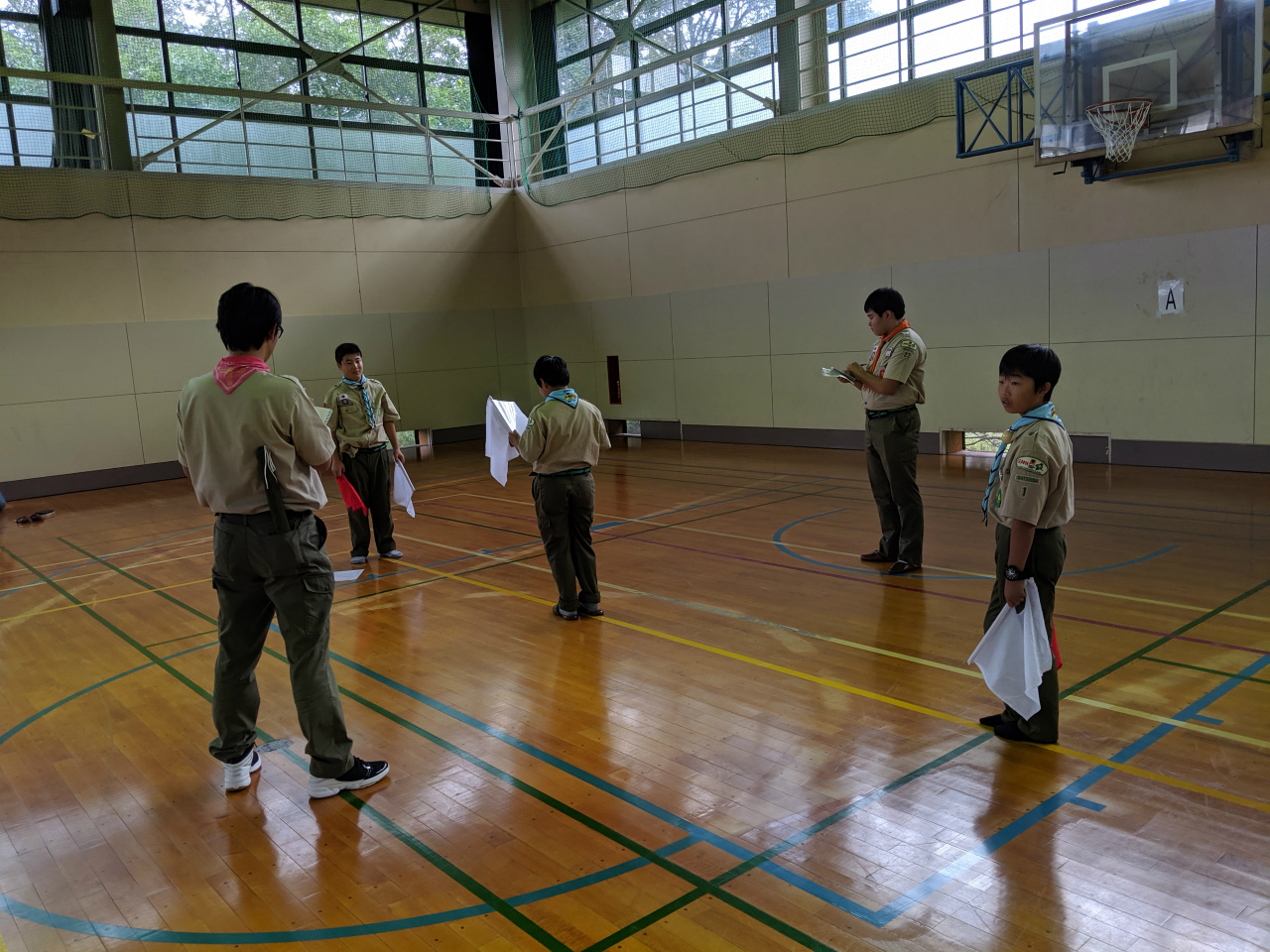 2日目は体育館に戻ってほかの参加者以外の班員と合流し、手旗信号を使ったゲームに挑戦しました。