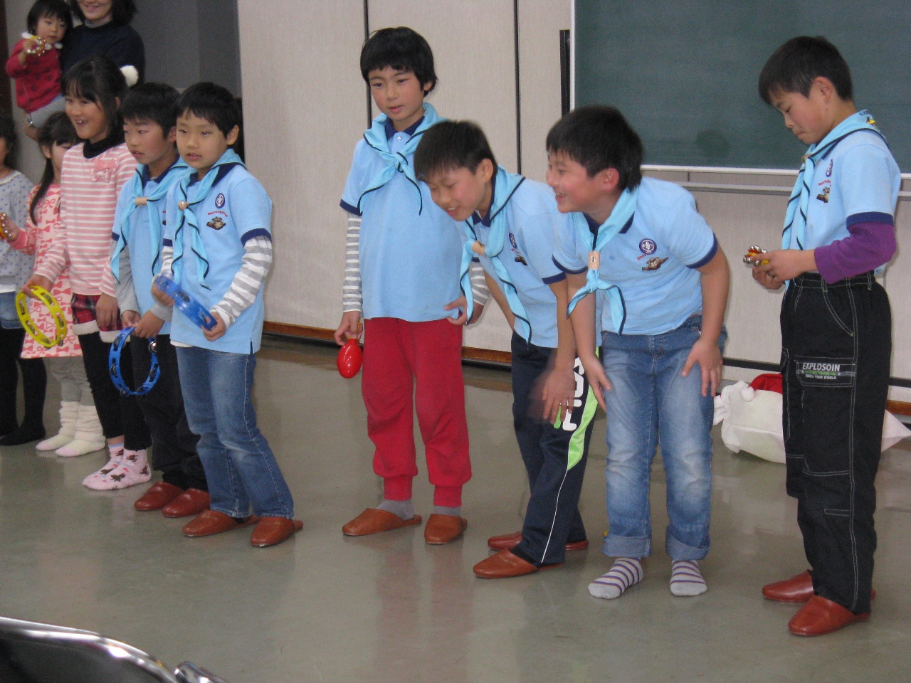 ビーバー隊は鈴などを持って「サンタが街にやって来る」「BINGO」の2曲を歌いました。