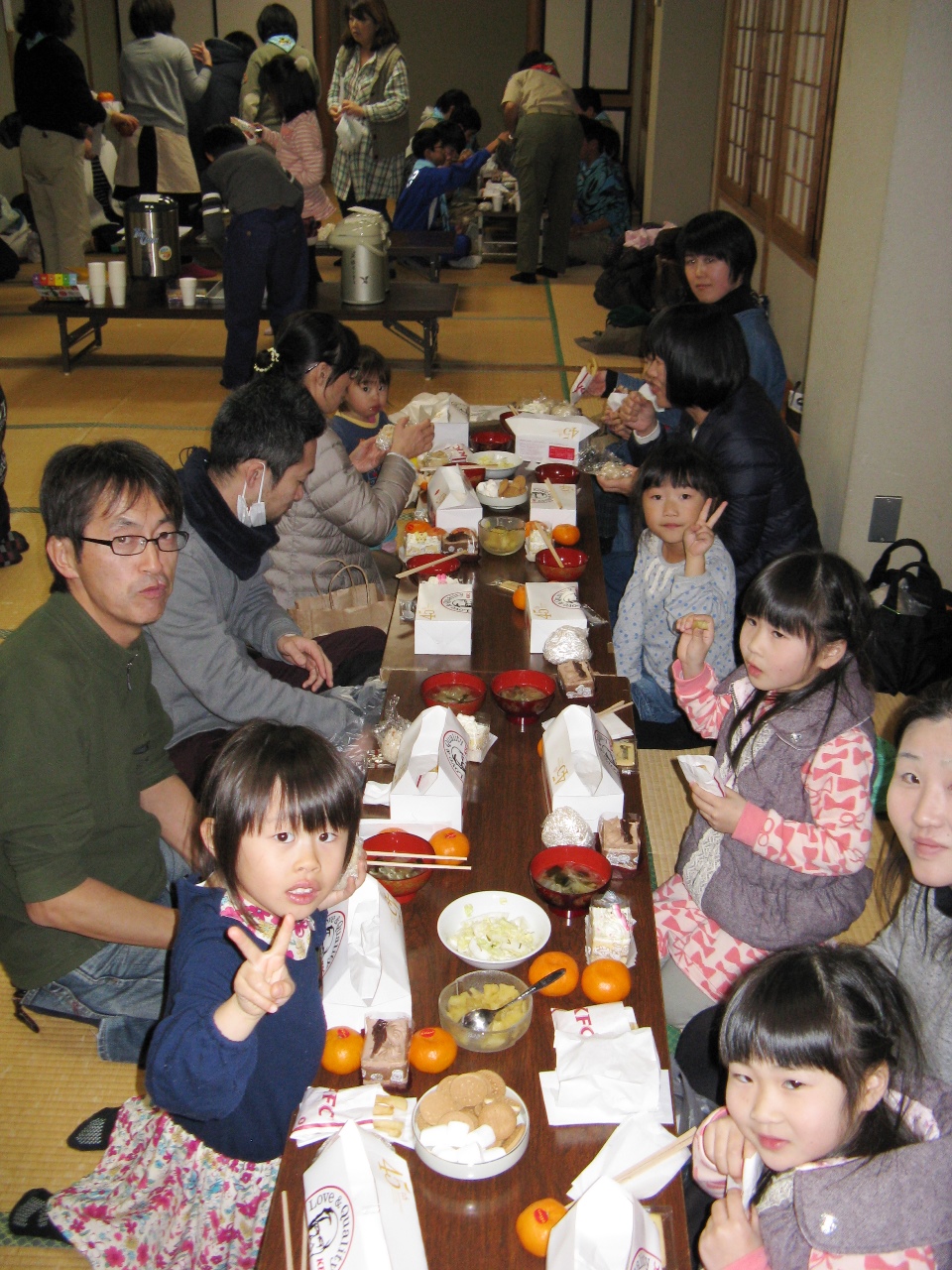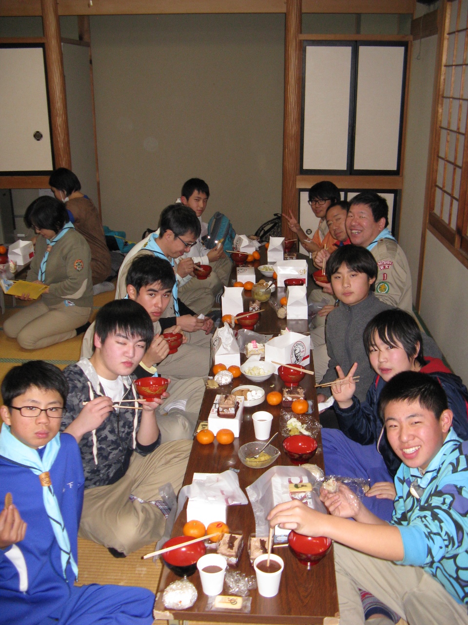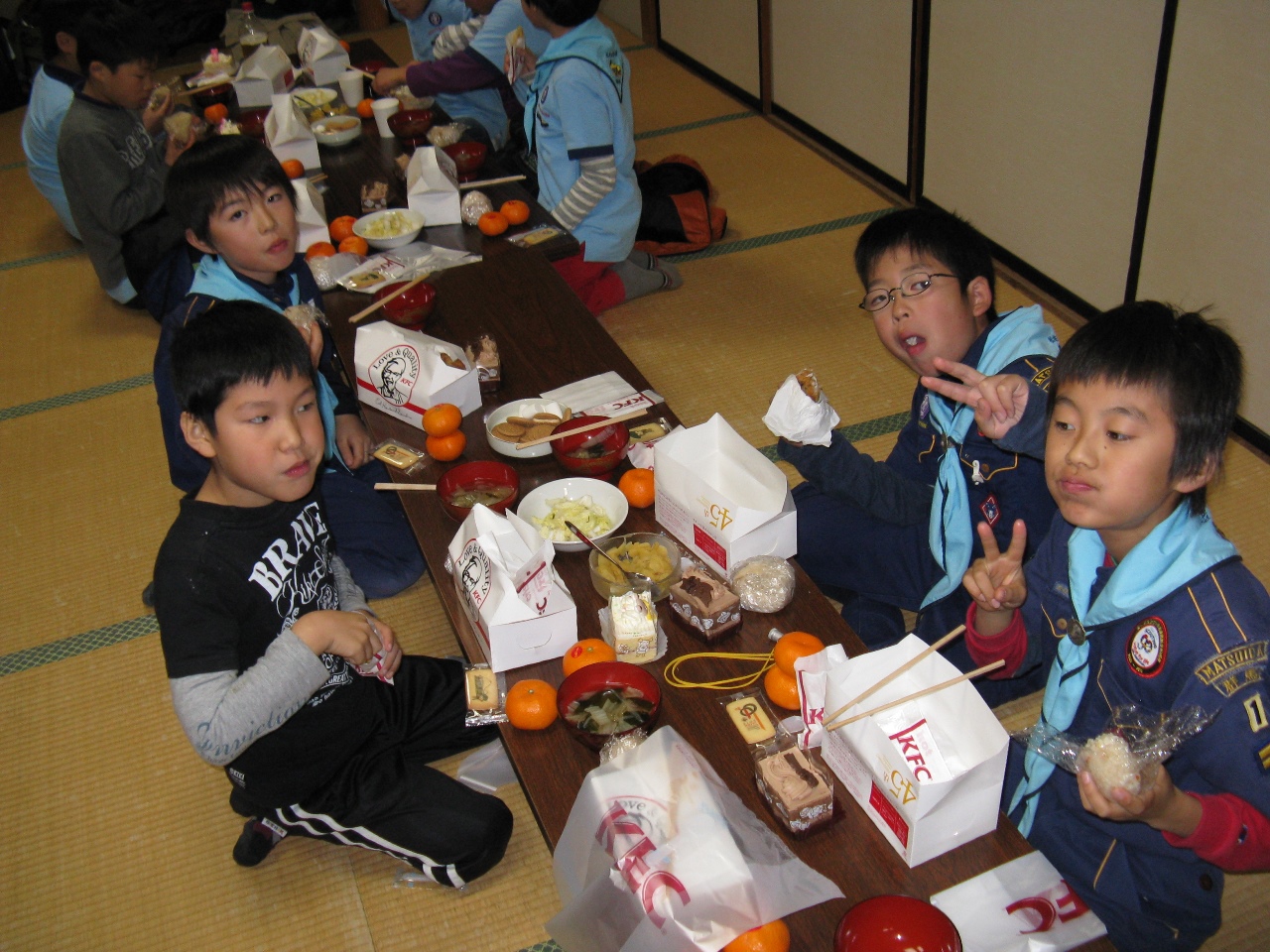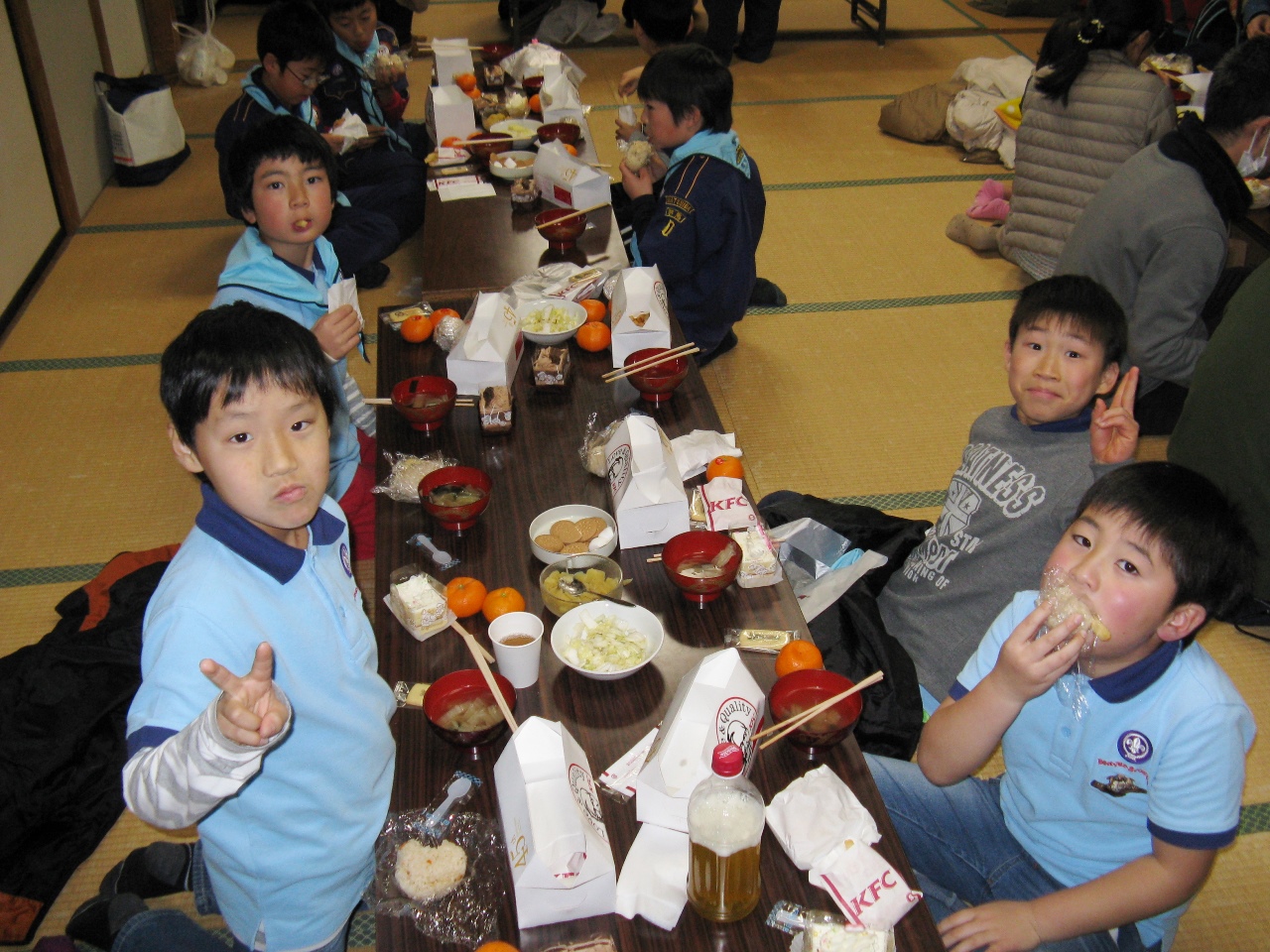 ボーイ隊と育成会の皆さんが作ってくれた料理とチキンとケーキを食べて、会話に花を咲かせました。