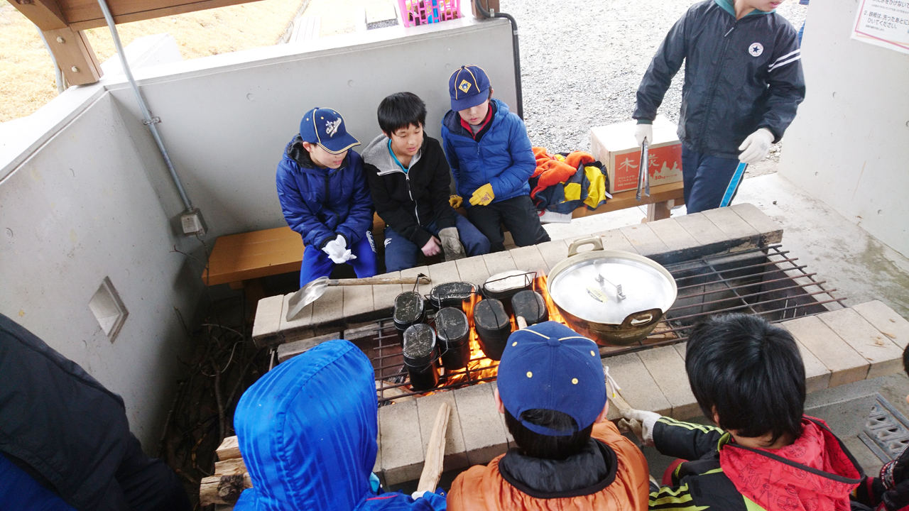 ビーバー隊と見学のお友達はスープの野菜の準備、カブ隊は飯ごうでご飯を炊く準備です。