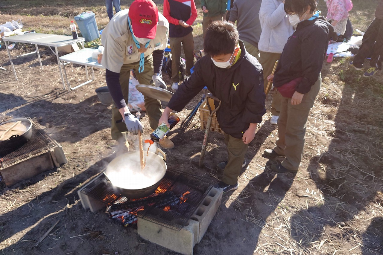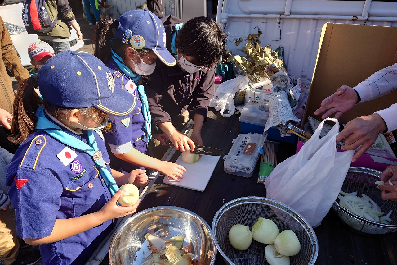 ボーイ隊はかまど作りの指導を受け、カレーうどんの調理と焼き芋をしました。