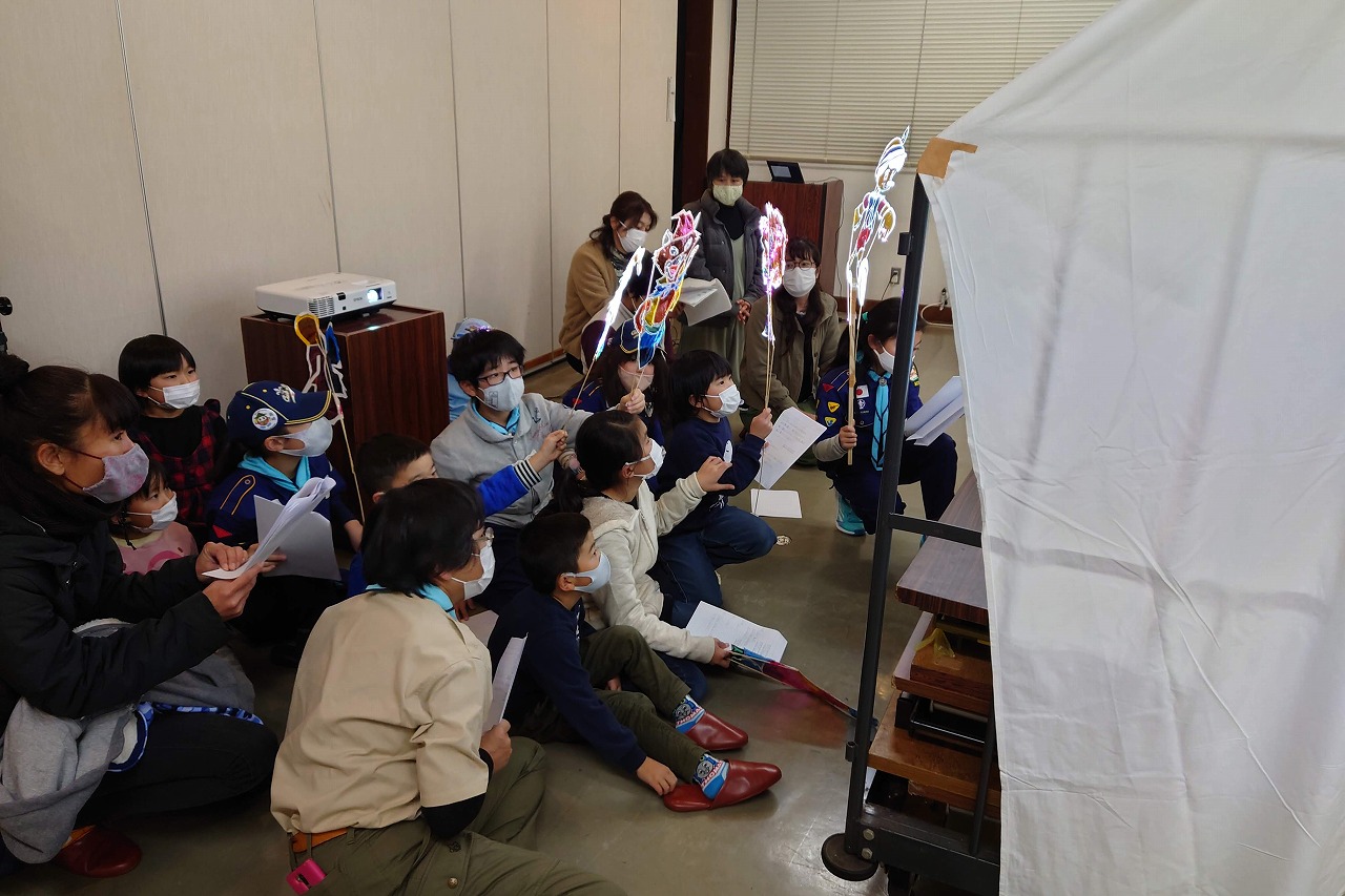 ビーバー隊とカブ隊は合同で影絵の披露をしました。