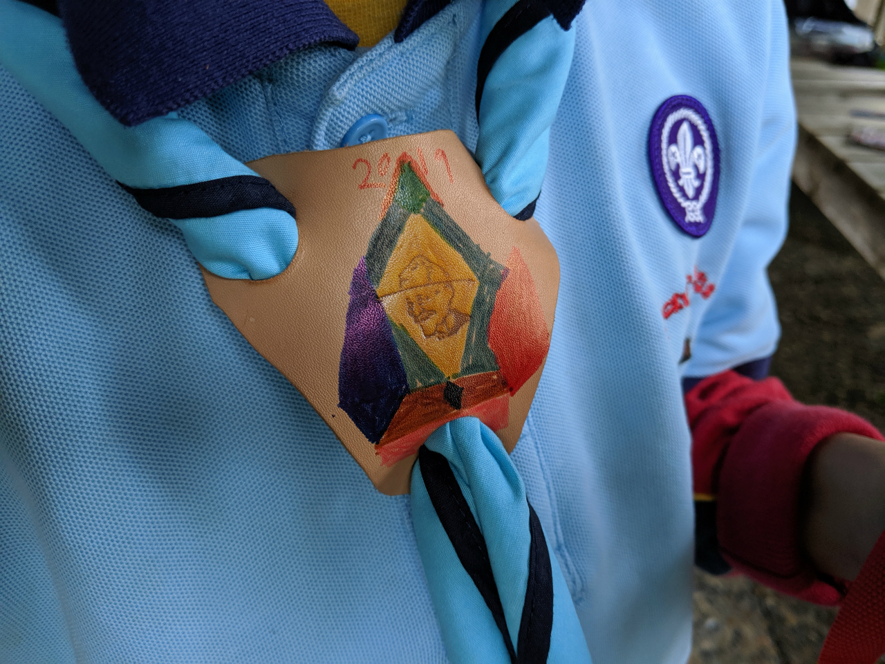 お昼の後は、革に焼き印をして色を塗ってチーフリング作りのクラフトをしました。
