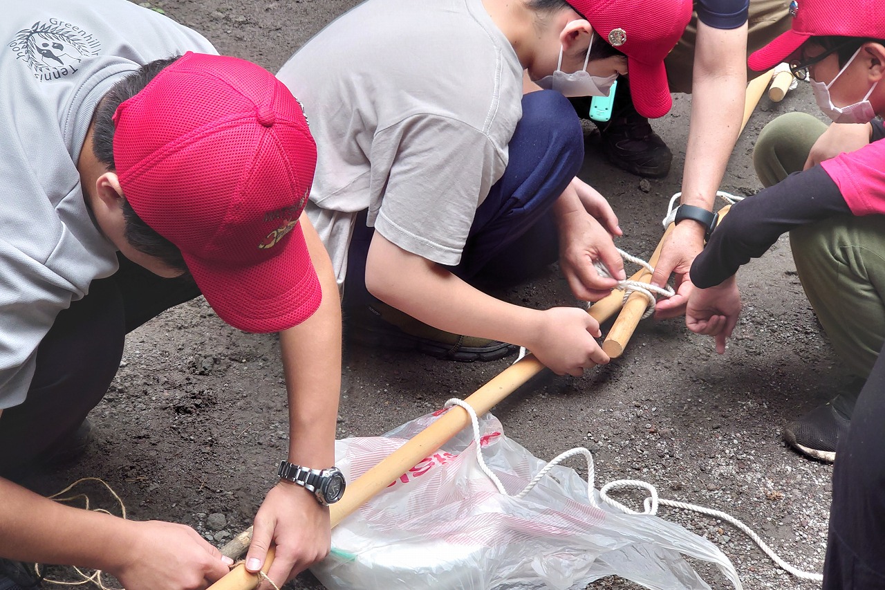 3本の木材をロープだけで縛り、班旗を高く掲げるゲームです。