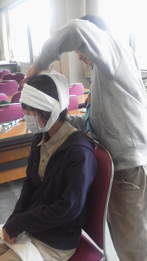 班員たちは、ゲーム感覚で三角巾での応急手当の仕方や