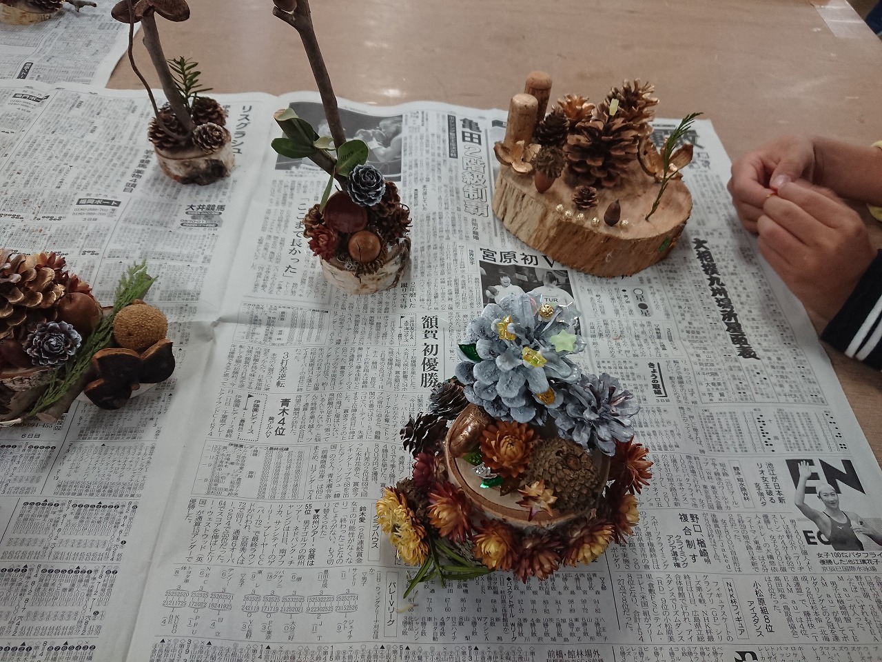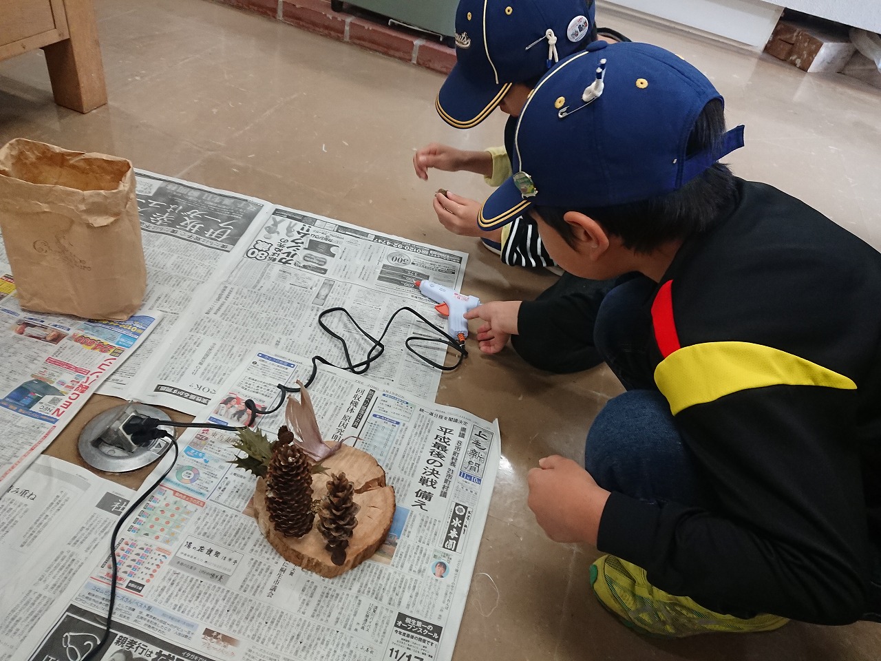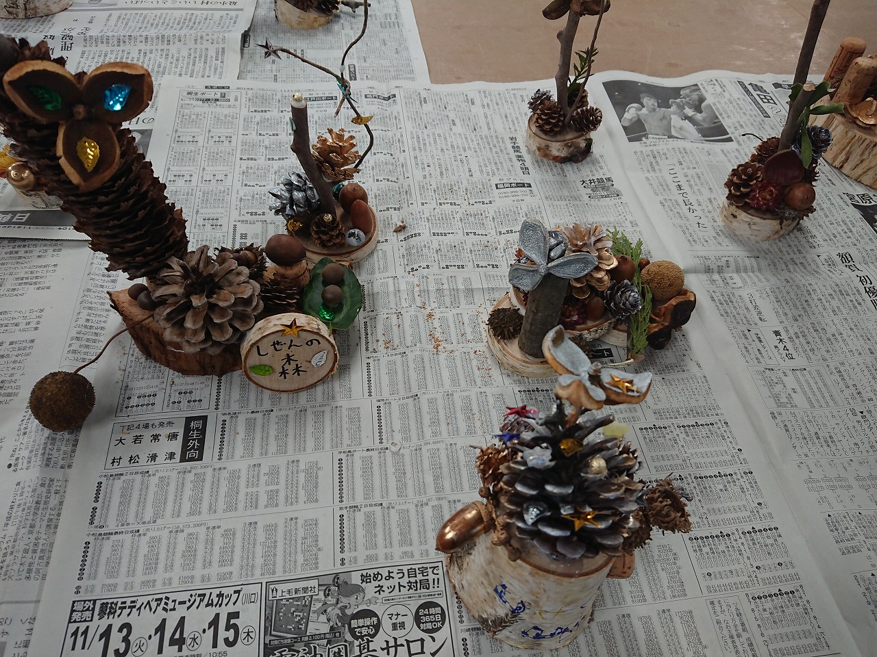 10月28日の集会で拾ったどんぐりや松ぼっくりに、スプレーで色をつけたり枝を切って貼り付けたりして、クリスマスツリーを作りました。