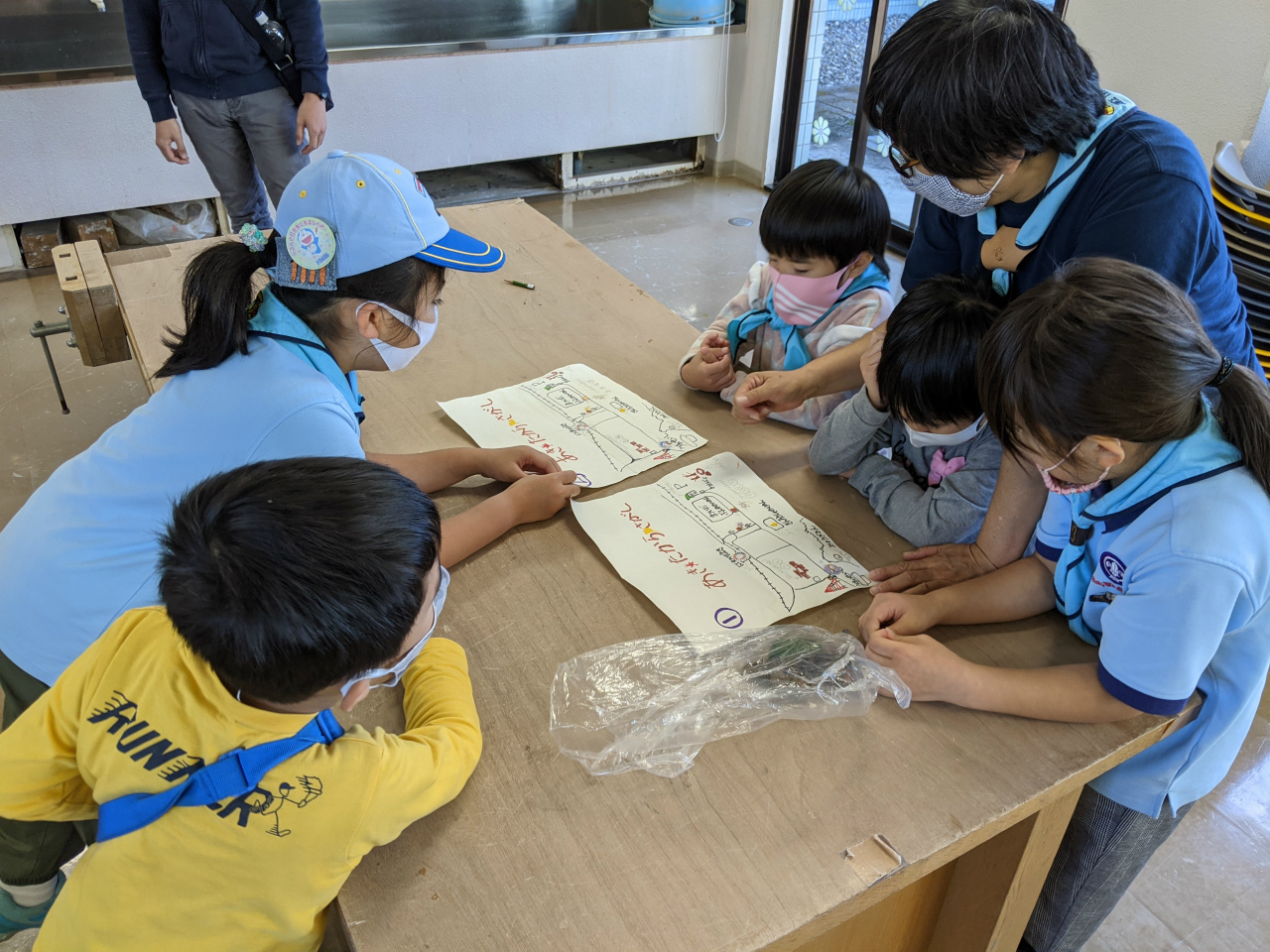 見つけた場所とチェックポイントのシールを見比べたり、見つけた建物や草花などを課題の地図に書き込みました。