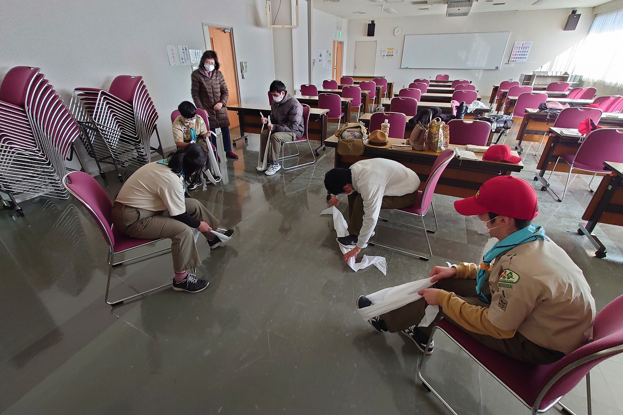 ボーイ隊は技能章「救急章」取得に向けた、応急手当の練習をしました。