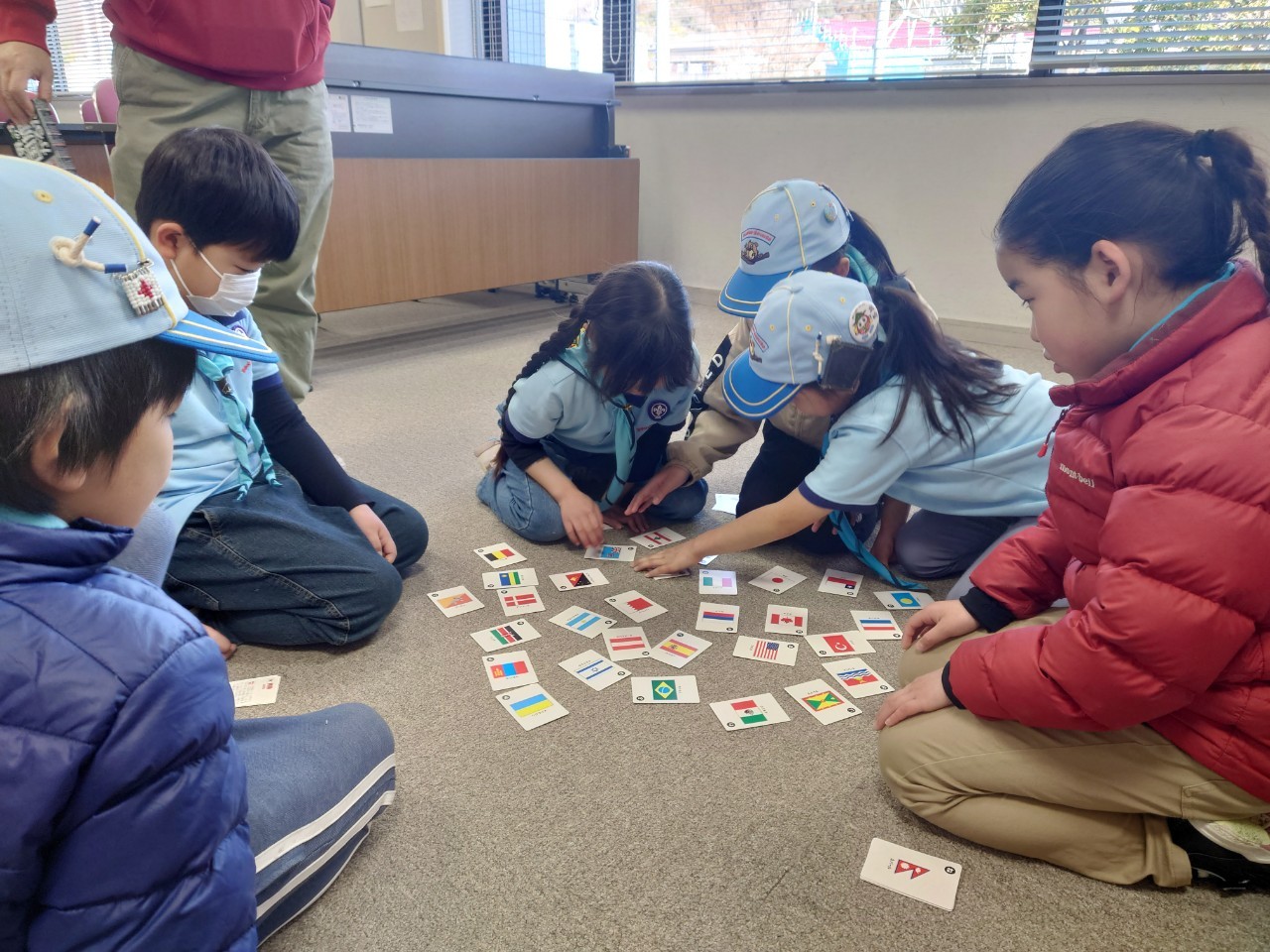 ビーバー隊は、国旗かるたを使ったゲームで国旗と世界地図の学習をしました。