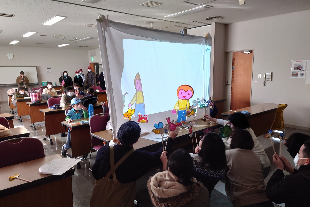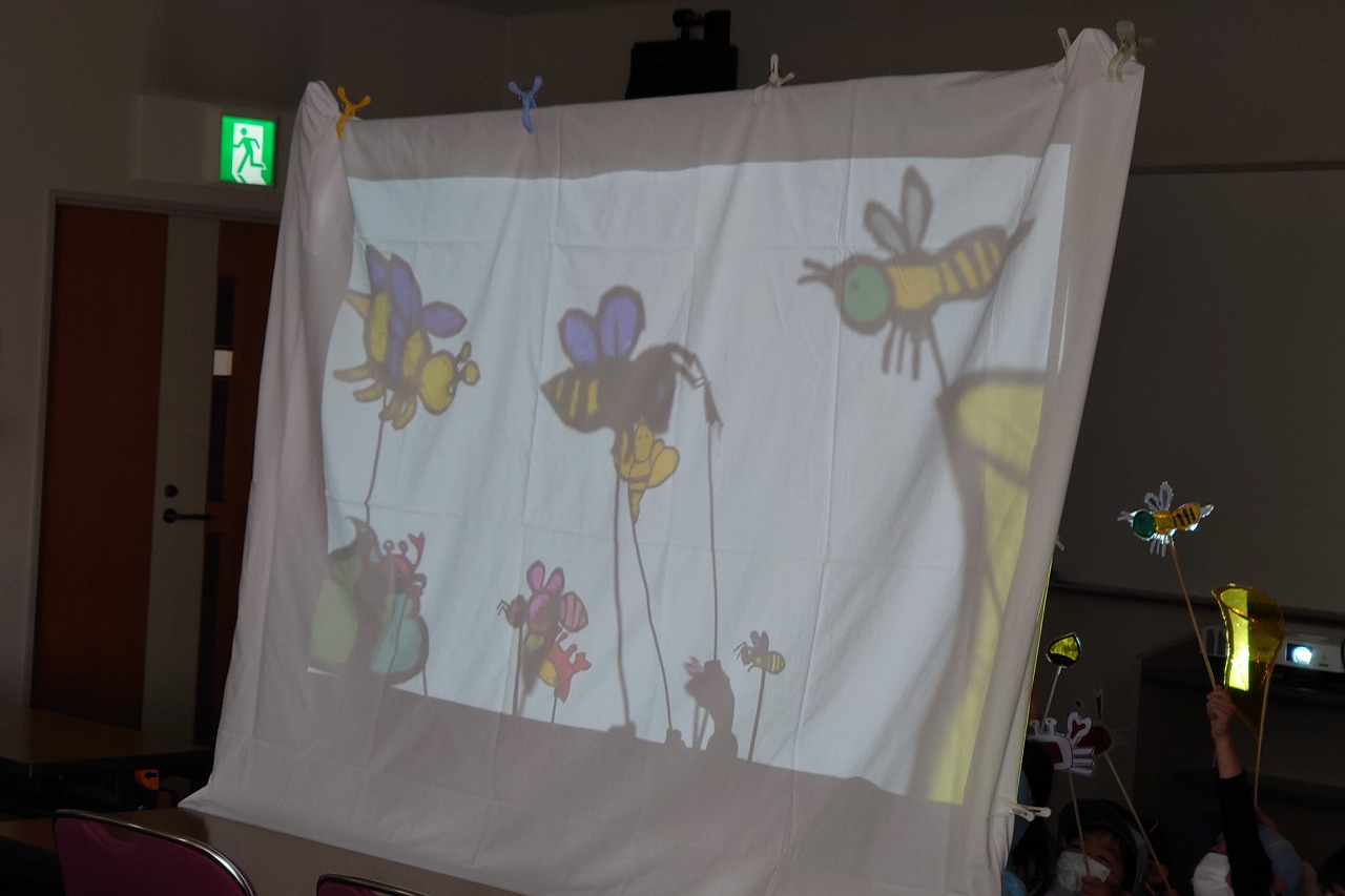 白いシーツとプロジェクターを使った簡易なスクリーンですが、カラーセロハンの色が出て「さるかに合戦」の雰囲気がよく出ていました。