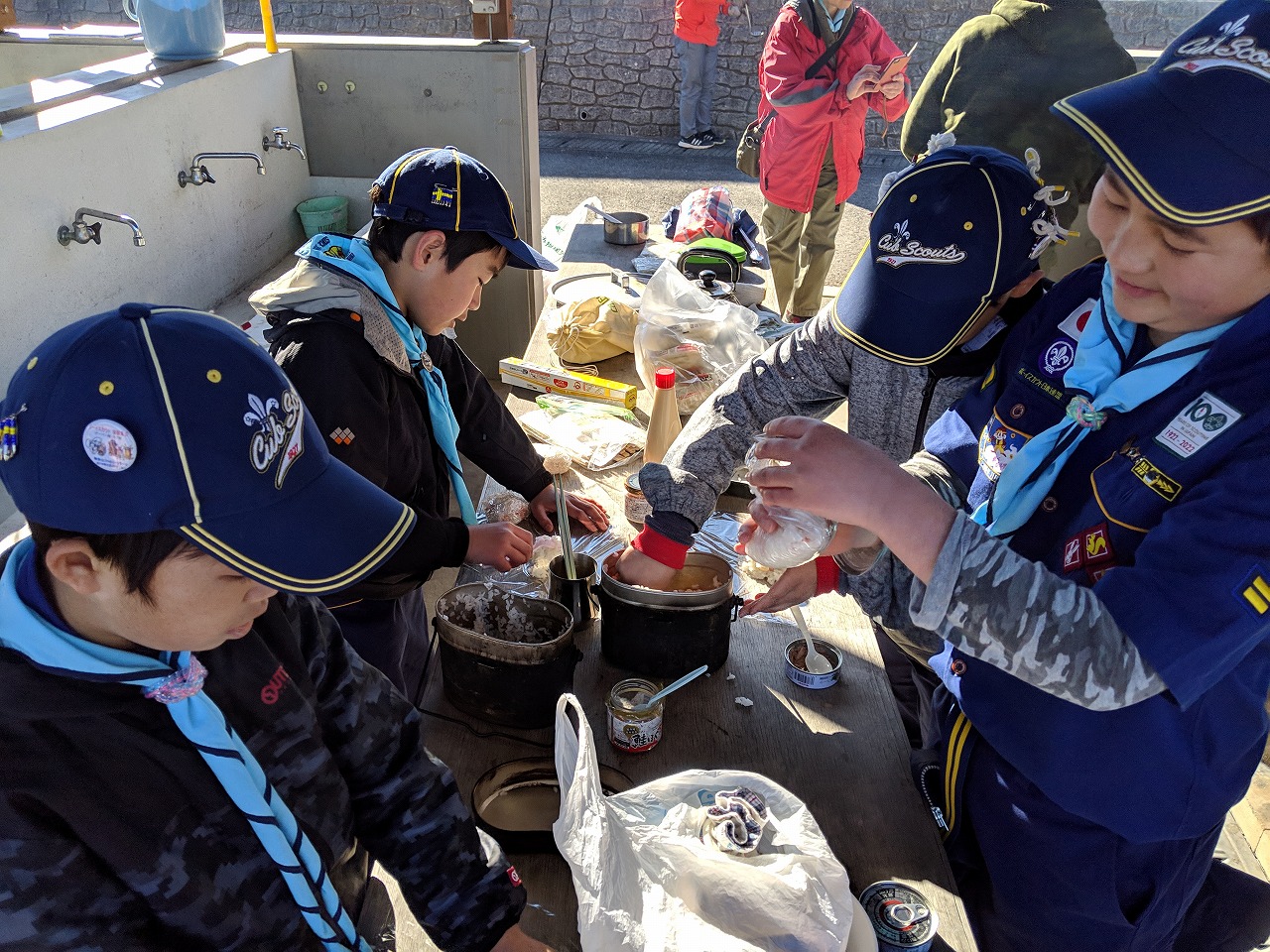 くまスカウトは朝作ったおにぎりを、その他のスカウトは持参した弁当を食べました。