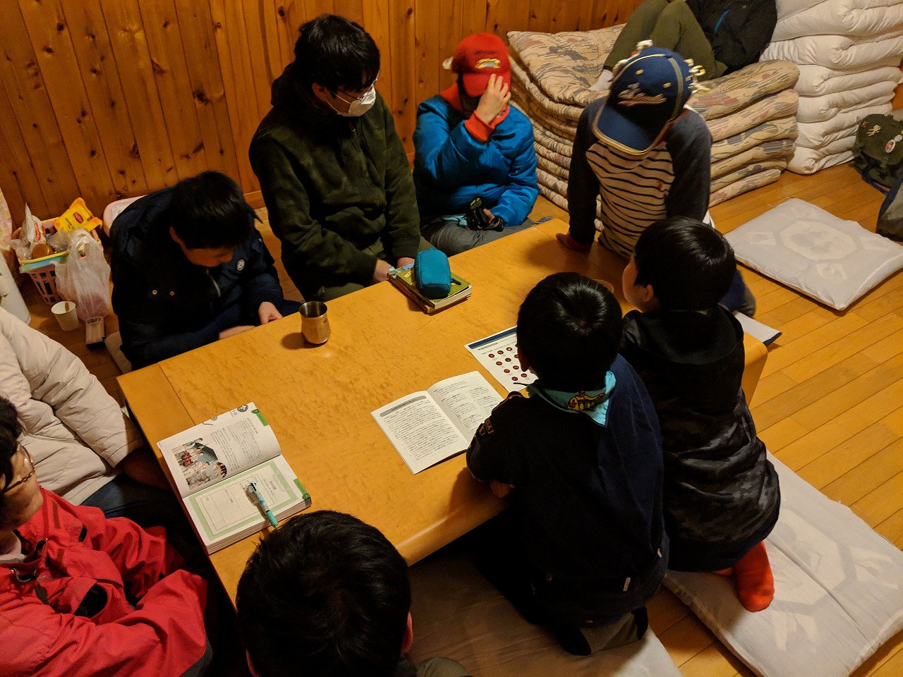 まずは、世界ジャンボリーに参加したスカウト・リーダーの話を聞き、写真を見せてもらったり、交換したワッペンやネッカチーフを見たりしました。