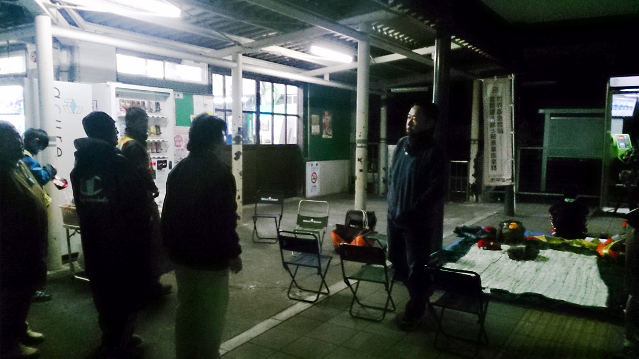 板鼻の国道の休憩所でボーイ隊長がシュラフや毛布を用意して迎えてくれます。